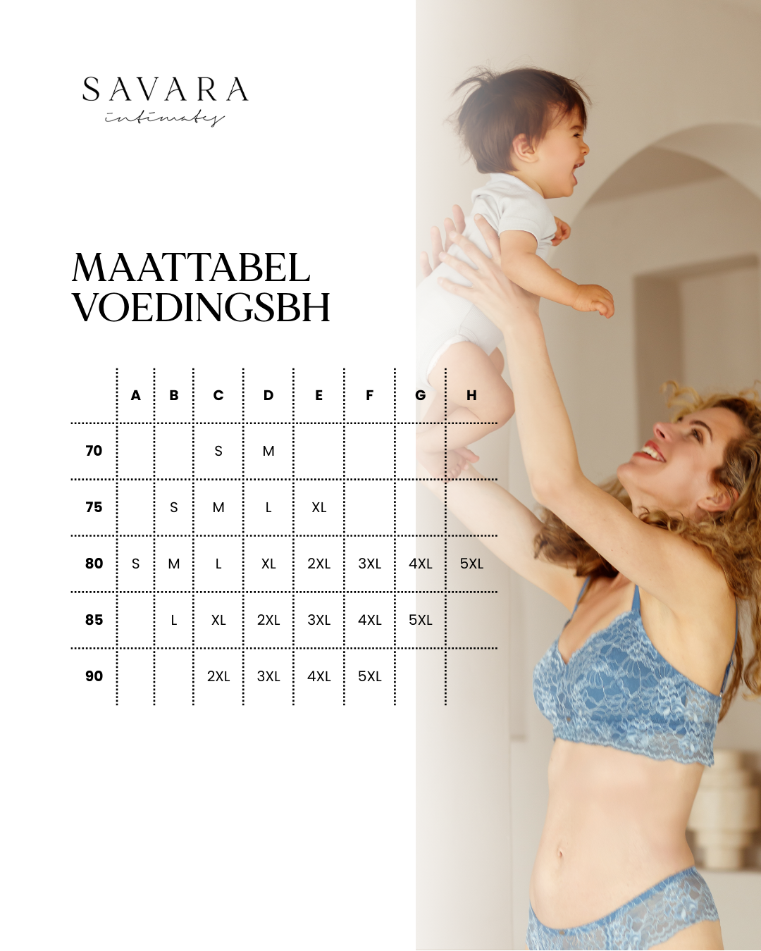 Stuur ons je omvang (onder de borst, in cm) en je borstomvang (gemeten over het breedste gedeelte van je borsten, vaak over de tepels) naar info@savaraintimates.com. We kijken graag met je mee welke maat het beste bij jou past.